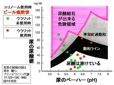 ところで、清水先生は非常にいい仕事をしておられます。先生の作られた図に私の尿のペーハー値をあてはめて考えてみましょう。ビールや酒を飲むと尿の尿酸がどんどん増えるじゃないですか。ところが、尿のペーハーは6以上のあたりがいいですよ。というのは、この辺のペーハーだと尿酸が溶けやすいのですね。尿酸値が少々上がっても、飽和ライン、準安定過飽和といって、この辺だと石ができないのです。石ができるのはこの赤で示したところなんです。そうすると、ここまでは清水先生の仕事ですが、では、自分の場合はどこに来るのだ?というのが患者の心理ですよね。私の場合、ユリノームを使わない、ウラリットも使わないときには、尿酸値は青○の高さなんです。では、ユリノームを使ってウラリットを使ってないときにはというと、ユリノームを使っているから尿中に尿酸がどんどん増えている(緑○)。それがもしペーハーが酸性だったら石ができるわけですね。では、ビールをさらに飲んだら、どうなるか。赤○のように尿中でさらに上がっているのです。