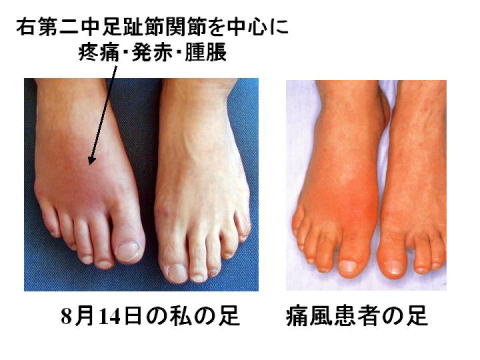 こ8月14日に撮った写真を他の患者さんの痛風発作の時の写真と比べてみると赤く腫れ上がった感じがとても似ていることがわかります。痛風発作の約70%は右の患者さんの足のように足の親指の付け根のところ(医学用語では第一中足趾節関節といいます)におこります。でも、その次に発作の起こることの多い場所が私の場合のように、隣のゆびの付け根の関節なのです。