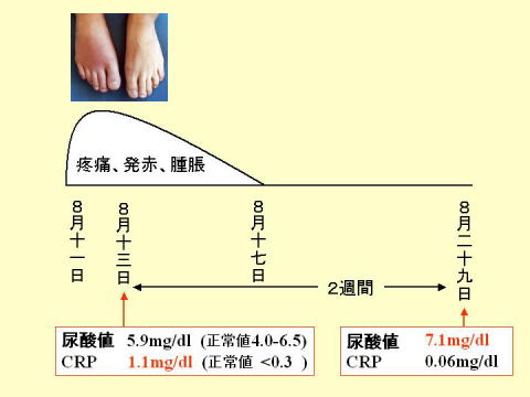 以上が異常値)。 発作中には大体1〜1.2mg/dl ぐらい下がって出るというのが常識で、そのため痛風発作中に測った尿酸値がこのように正常値になることはめずらしくはないのです。ただ、ここで面白いのは、CRPという炎症の指標が1.1mg/dl まで上がっている(正常は 0.3mg/dl 以下)。すなわち、炎症が起こっているということになります。このCRPが正常になる2週間後ぐらいに尿酸値がどうなるか。大体1〜1.5mg/dlほどを足せばいいのですが、私の場合も、計算どおりにCRPが正常化した時点での尿酸値は7.1mg/dl