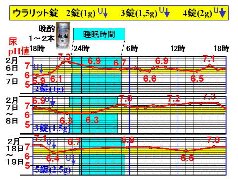(30錠)ガバッと飲んでみても動かない。ただ、明くる日はリバウンドで7.6と、どんと上がっていく。だから、出来かかった結石は溶けてしまう。結論から言うと、痛飲した時は、その後、寝る前に、飲んだ量に応じて3〜5グラムもウラリットを服用すれば安心ということになる。