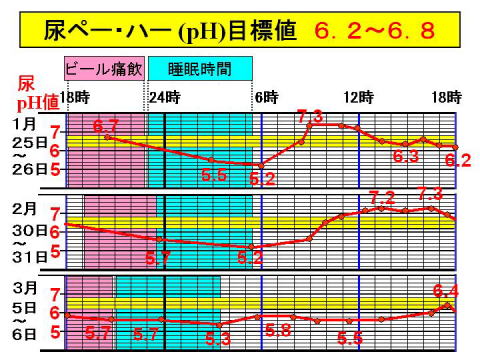 だから、これで尿のペーハーがどう変化するかみてみようという妙案が浮かびました。すると、6.9の11時が5.9まで下がった。1000cc